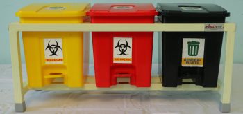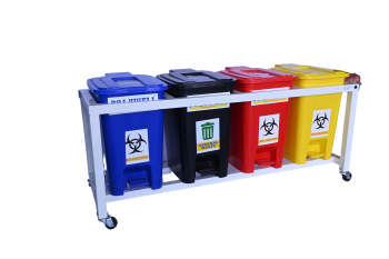 A waste segregation trolley (HF56) with multiple color-coded bins for organized and efficient waste sorting.