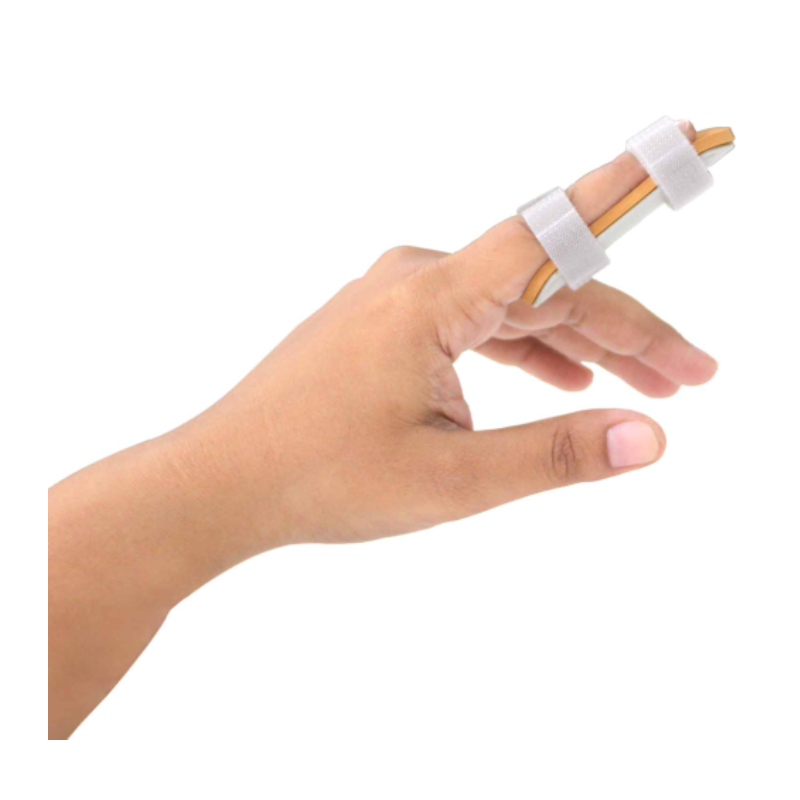 Place the gutter finger splint along the injured finger, ensuring it aligns with the finger’s natural curve. Insert the finger into the splint, aligning it with the gutter. Secure the splint with straps or bandages around the finger and hand. Tighten the straps to hold the splint firmly but comfortably. Ensure the splint keeps the finger straight and immobile without causing discomfort.